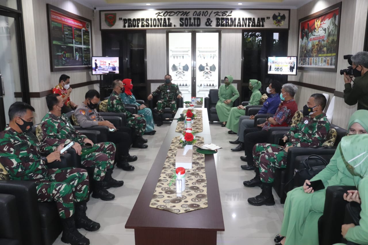 Bandar Lampung – Komandan Kodim 0410/KBL Kolonel Inf Romas Herlades, S.E.,M.Si.,M.M., didampingi Ketua Persit KCK Cab. XXX Dim 0410/KBL Ny. Esa Romas Herlandes, menyambut kunjungan kerja Danrem 043/Gatam Brigjen TNI Drajad Brima Yoga, S.Ip.,M.H., dan Ketua Persit KCK Koorcab Rem 043 PD II/Swj Ny.Epie Drajad Brima Yoga bertempat di Kodim 0410/KBL Jln. Imam Bonjol Kel. Langkapura Kota Bandar Lampung. Jum’at (07/5/2021)