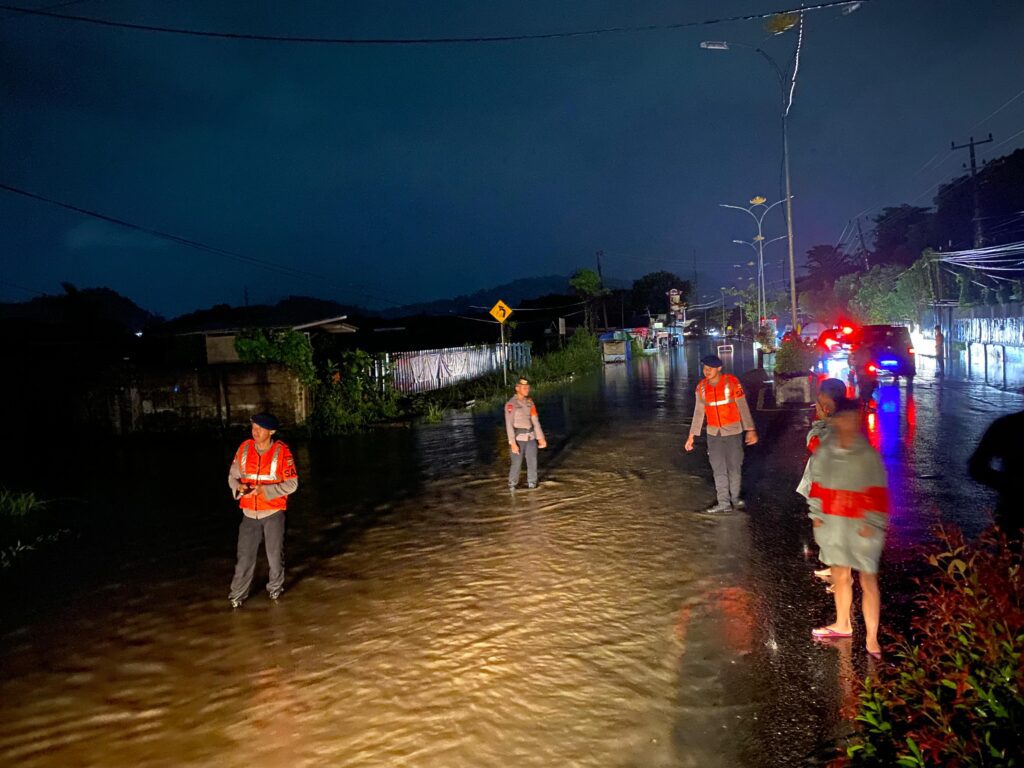 BANYUWULU.COM- Lampung – BrimobLampung – Mengantisipasi Curah hujan yang cukup tinggi Jum’at 17 Januari 2025 yang menyebabkan banjir dibeberapa titik dikota Bandarlampung dan berdasarkan informasi Badan Penanggulangan Bencana Daerah (BPBD) Provinsi Lampung mengingatkan warga untuk waspada dengan curah hujan yang diprediksi masih akan turun hingga pukul 22.00 WIB.