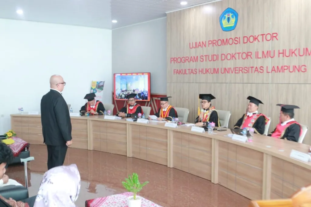 Promovendus Topan Indra Karsa, S.H., M.H., mempresentasikan hasil penelitiannya secara langsung di hadapan tim penguji yang dipimpin Wakil Rektor Bidang Umum dan Keuangan (BUK) Unila Prof. Rudy, LL.M., LL.D., yang mewakili Rektor Unila.