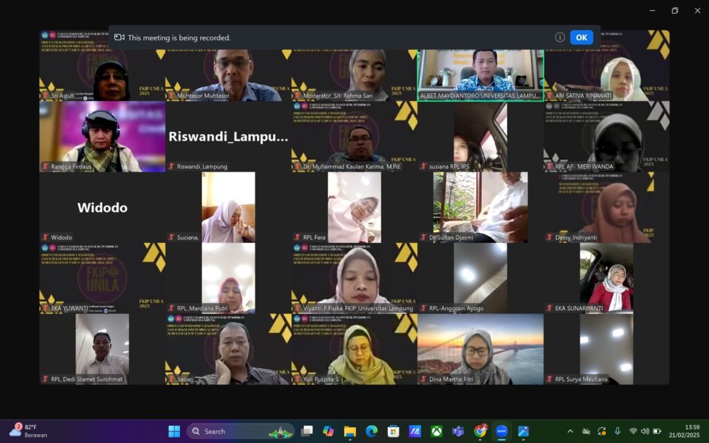Pengenalan Sistem Akademik Pascasarjana berlangsung pada Jumat, 21 Februari 2025, melalui platform Zoom Meeting dan dihadiri oleh Dekan FKIP UNILA, Dr. Albet Maydiantoro, M.Pd., para Wakil Dekan, Tim RPL Universitas Lampung, Ketua Program Studi (Kaprodi) yang menyelenggarakan jalur RPL, dosen, serta tim pengajar RPL. Selain itu, mahasiswa magister jalur RPL Angkatan I Semester Genap Tahun Akademik 2024-2025 juga turut hadir dalam acara ini. Kegiatan ini merupakan bagian dari proses pengenalan bagi mahasiswa baru yang bergabung melalui jalur Rekognisi Pembelajaran Lampau (RPL).