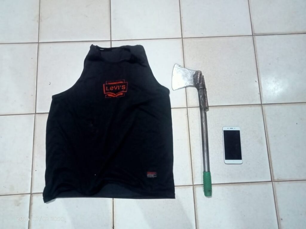 Setelah berhasil membongkar kebohongan tersangka, Petugas Kepolisian langsung melakukan proses penahanan, serta menyita berbagai barang bukti, antara lain : kaos, senjata tajam jenis kampak besi, telepon genggam, serta beberapa screenshot bukti transfer dan deposit pada akun judi online tersangka.
