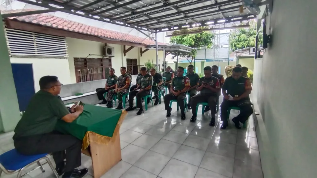 BANYUWULU.COM – Bandar Lampung – Danramil 410-06/Kedaton Mayor Kav Joko Subroto, berikan pengarahan atau Jam Komandan, kepada personil di markas Koramil Kedaton, jalan Soekarno Hatta, Kota Bandar Lampung, Rabu (13/3/2024)
