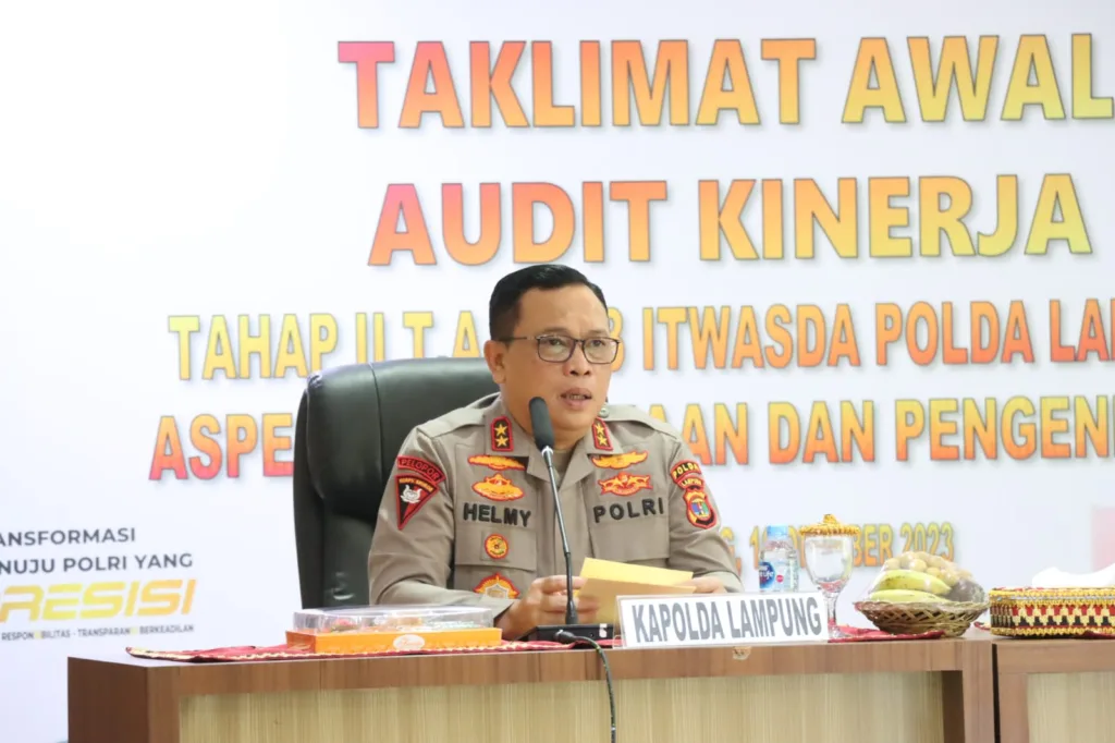 Banyuwulu.com – BandarLampung – Kapolda Lampung Irjen pol Helmy Santika dan Wakapolda Lampung Brigjen Pol Umar Effendi mengikuti kegiatan Taklimat Awal Audit Kinerja Itwasda Polda Lampung Tahap II TA. 2023 Tentang Aspek Pelaksanaan dan Pengendalian di Mapolresta BandarLampung. Senin (16/10/2023).