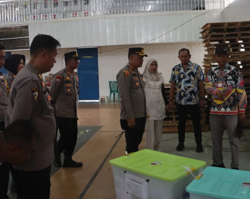 BANYUWULU.COM – Lamteng – Guna memastikan pergeseran logistik Pemilu 2024 pasca rekapitulasi hasil suara di tingkat PPK atau Kecamatan, Kapolres Lampung Tengah, Polda Lampung AKBP Andik Purnomo Sigit, S.H., S.I.K., M.M bersama Komisioner KPU melakukan pengecekan di gudang KPU yang bertempat di Kampung Poncowati Kecamatan Terbanggi Besar, Lampung Tengah. Jumat (23/2/24).