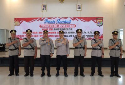 banyuwulu.com –  Jajaran Polres Lampung Tengah,Polda Lampung menggelar upacara Pelantikan Kabag SDM, serah terima jabatan (sertijab) sekaligus pisah sambut Kabag Logistik dan Kapolsek Punggur di aula Atmani Wedhana Polres Lampung Tengah, Selasa pagi (14/3/23).