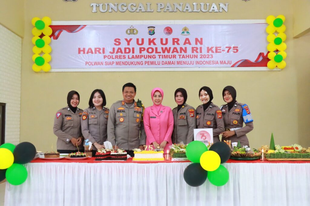 Banyuwulu.com – LAMPUNG TIMUR – Kapolres Lampung Timur AKBP M. Rizal Muchtar didampingi oleh Ketua Bhayangkari Cabang Lampung Timur, Ny.Ririn Rizal, menghadiri syukuran ulang tahun ke-75 Polwan. Acara berlangsung di Aula Tribrata Polres Lampung Timur. Selasa (5/9/2023).