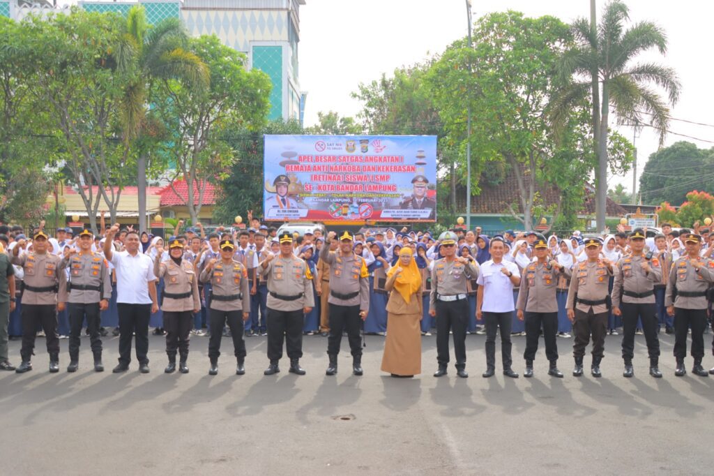 BANYUWULU.COM- Bandar Lampung – Ratusan pelajar tingkat Sekolah Menengah Pertama (SMP) dari berbagai sekolah di Kota Bandar Lampung mengikuti apel besar satgas remaja anti narkoba dan kekerasan angkatan pertama tashun 2025 yang digelar di Lapangan Mapolresta Bandar Lampung, Selasa (11/2/2025) pagi.