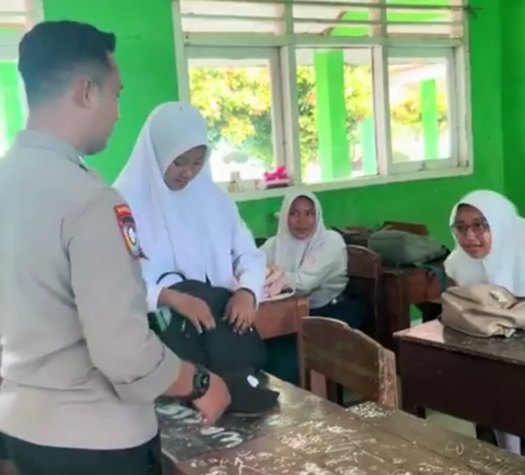 “Jadi anggota ini setelah upacara berinisiatif masuk ke kelas yang disebut terdapat siswa yang berdandan berlebihan. Kebetulan saat itu belum ada guru pengajar/jam kosong. Didampingi wali kelas, Pak Eko meminta ijin untuk menyapa adik-adik di kelas tersebut”, jelas Kabid Humas.