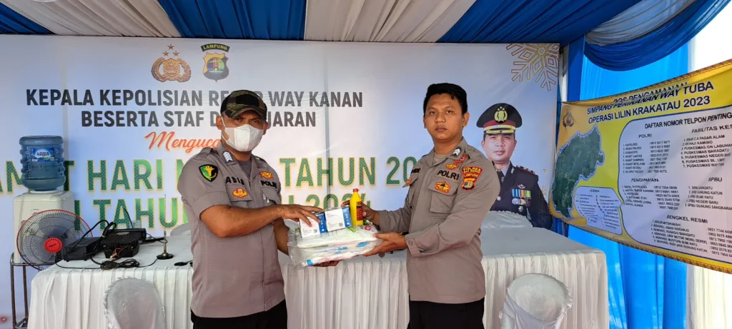 Kapolres Way Kanan AKBP Pratomo Widodo melalui Ps Kasidokkes Polres Way Kanan Bripka Adi Sugianto menyampaikan kunjungannya ke Pospam untuk melakukan pemeriksaan kesehatan sekaligus memberikan multivitamin untuk menunjang stamina dan alat kesehatan habis pakai berupa APD, masker, kasa steril dan betadine untuk protokol kesehatan pada personel yang terlibat dalam Operasi Lilin Krakatau 2023.