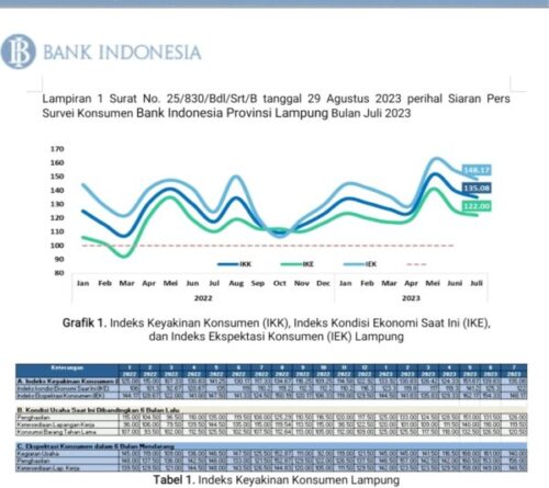 Banyuwulu.com – BANDARLAMPUNG- Keyakinan masyarakat Lampung terhadap kinerja ekonomi Lampung secara keseluruhan pada Juli 2023 tetap kuat. Hal ini terkonfirmasi dari hasil Survei Konsumen Bank Indonesia Provinsi Lampung (BI Lampung) yang menunjukkan bahwa Indeks Keyakinan Konsumen (IKK) masih berada pada level optimis (>100) sebesar 135,08. Optimisme konsumen tersebut tercatat lebih rendah jika dibandingkan dengan 139,83 pada bulan Juni 2023, namun tercatat lebih tinggi jika dibandingkan dengan periode yang sama tahun sebelumnya yakni 117,33. IKK Juli 2023 di Lampung yang tetap positif, sejalan dengan IKK Nasional pada Juli 2023 yang sebesar 123,5, atau tetap berada pada level optimis. IKK Lampung yang kuat ditopang oleh Indeks Kondisi Ekonomi Saat Ini (IKE) dan Indeks Ekspektasi Konsumen (IEK) yang tetap optimis.