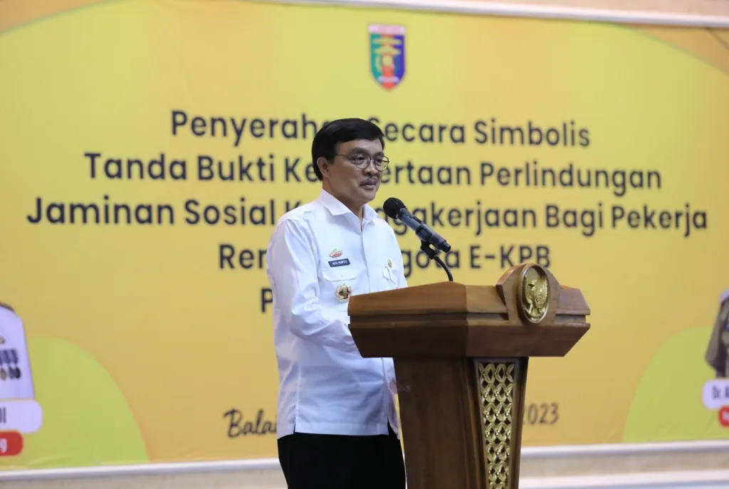 Tanda bukti kepersertaan perlindungan Jamsostek tersebut diserahkan Staf Ahli Gubernur Lampung Bidang Kemasyarakatan dan Sumber Daya Manusia(SDM) Intizam, mewakili Gubernur Lampung Arinal Djunaidi, di Balai Keratun, Kompleks Kantor Gubernur, Bandarlampung, Rabu, (20/12/2023).