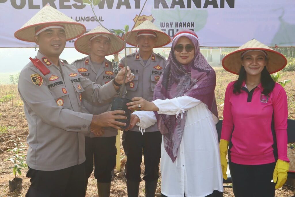 Penanaman pohon dengan tema “Polri Lestarikan Negeri Penghijauan Sejak Dini” dipimpin langsung oleh Kapolres Way Kanan AKBP Pratomo Widodo didampingi Ibu Ketua Cabang Bhayangkari Way Kanan Ny. Ade Pratomo Widodo.