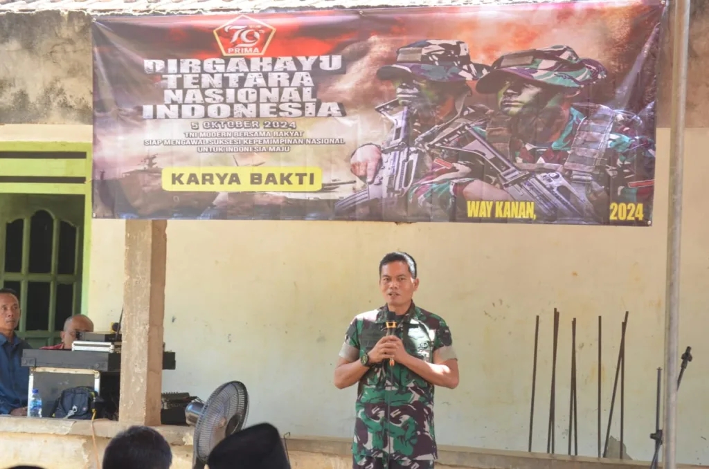 BANYUWULU.COM- Way Kanan – Komandan Kodim 0427/Way Kanan Letkol Inf Aan Fitriadi, S.I.P., M.Hub.Int membuka kegiatan Karya Bakti TNI di Masjid Baitul Izza Dusun Badran Sari Kampung Rantau Jaya Kecamatan Banjit Kabupaten Way Kanan, Senin (30/09/2024).