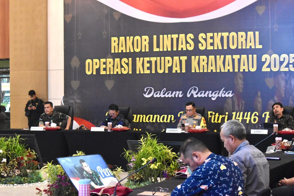 BANYUWULU.COM- Bandar Lampung – Polda Lampung menggelar Rapat Koordinasi (Rakor) Lintas Sektoral Persiapan Pengamanan Hari Raya Idul Fitri 1446 H/2025. Rakor ini dilaksanakan untuk memastikan pelaksanaan pengamanan saat arus mudik dan arus balik berjalan lancar dan aman. Kegiatan dilaksanakan di GSG Presisi Polda Lampung, Jumat, 14 Maret 2025.