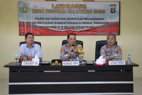Kapolres Way Kanan AKBP Teddy Rachesna menyampaikan Polres Way Kanan berserta jajaran akan melaksanakan Operasi Kepolisian Kewilayahan dengan sandi ops “Bina Kusuma Krakatau 2023”, yang mana garda terdepan pada pelaksanaan kegiatan ini adalah satuan fungsi Binmas.