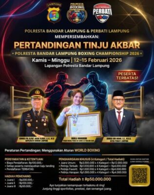 BANYUWULU.COM – Bandar Lampung – Polresta Bandar Lampung bekerja sama dengan Persatuan Tinju Amatir Indonesia (Perbati) Lampung akan menggelar pertandingan tinju bertajuk Polresta Bandar Lampung Championship 2026. Kegiatan tersebut akan berlangsung selama empat hari, mulai Kamis hingga Minggu, 12–15 Februari 2026, di Lapangan Polresta Bandar Lampung.