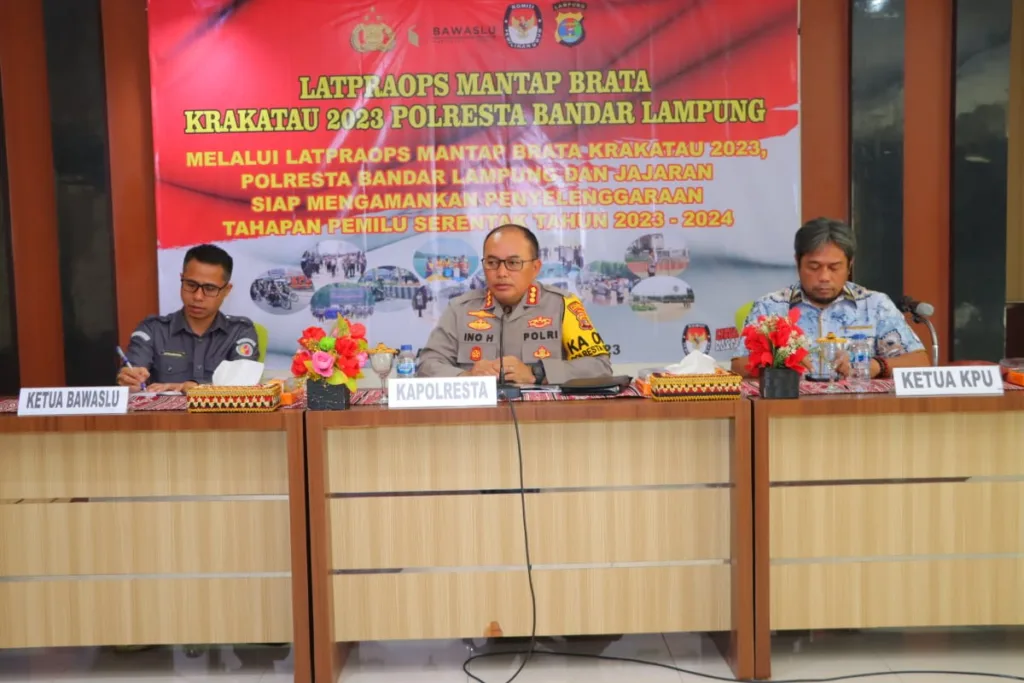 Digelar di Aula Patria Tama Mapolresta Bandar Lampung, kegiatan ini dihadiri oleh Kapolresta Bandar Lampung Kombes Pol Ino Harianto, S.I.K., M.M., Ketua KPU Bandar Lampung Dedy Triyadi, S.E.,S.H, Ketua Bawaslu Kota Bandar Lampung Apriliwanda, SH, Para Pejabat Utama Polresta Bandar Lampung, Para Kapolsek Jajaran dan personel yang terlibat dalam Ops Mantab Brata Krakatau 2023.