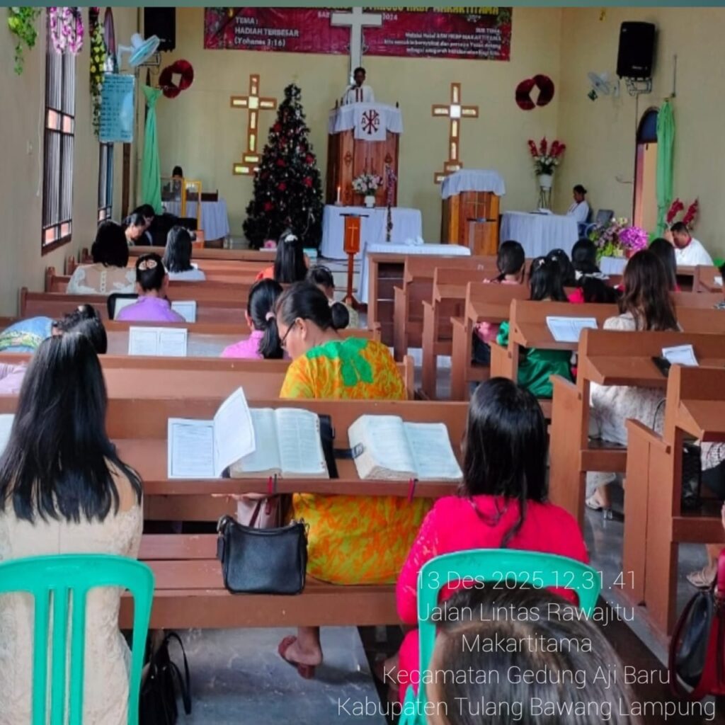 Ibadah Natal yang dipimpin oleh Pendeta Yohanes Ferdinan Saputra, S.Th tersebut mengangkat tema “Allah Hadir Untuk Menyelamatkan Keluarga”, dan diikuti sekitar 100 jemaat. Tercatat kendaraan jemaat yang hadir sebanyak 5 unit sepeda motor dan 20 unit kendaraan roda empat.