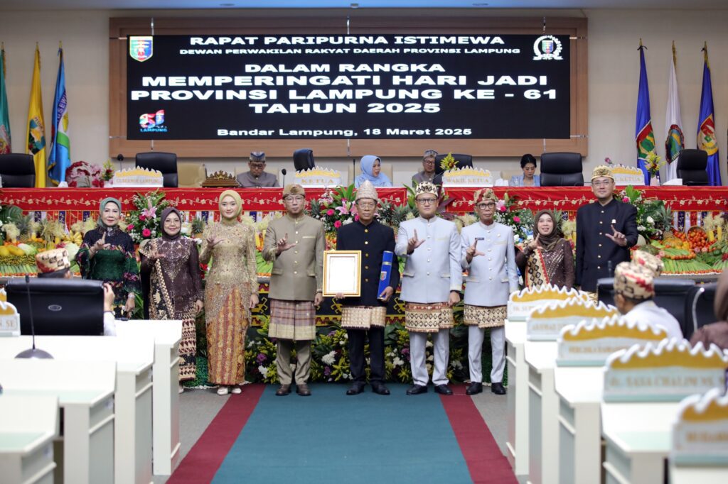 BANYUWULU.COM- BANDARLAMPUNG —– Rapat Paripurna Istimewa DPRD Lampung dalam rangka Memperingati Hari Jadi Provinsi Lampung ke-61 di Ruang Sidang DPRD Provinsi Lampung, Selasa (18/3/2025), berlangsung penuh semangat kebersamaan. Gubernur Lampung Rahmat Mirzani Djausal memotivasi seluruh komponen masyarakat mewujudkan visi “Bersama Lampung Maju Menuju Indonesia Emas”.