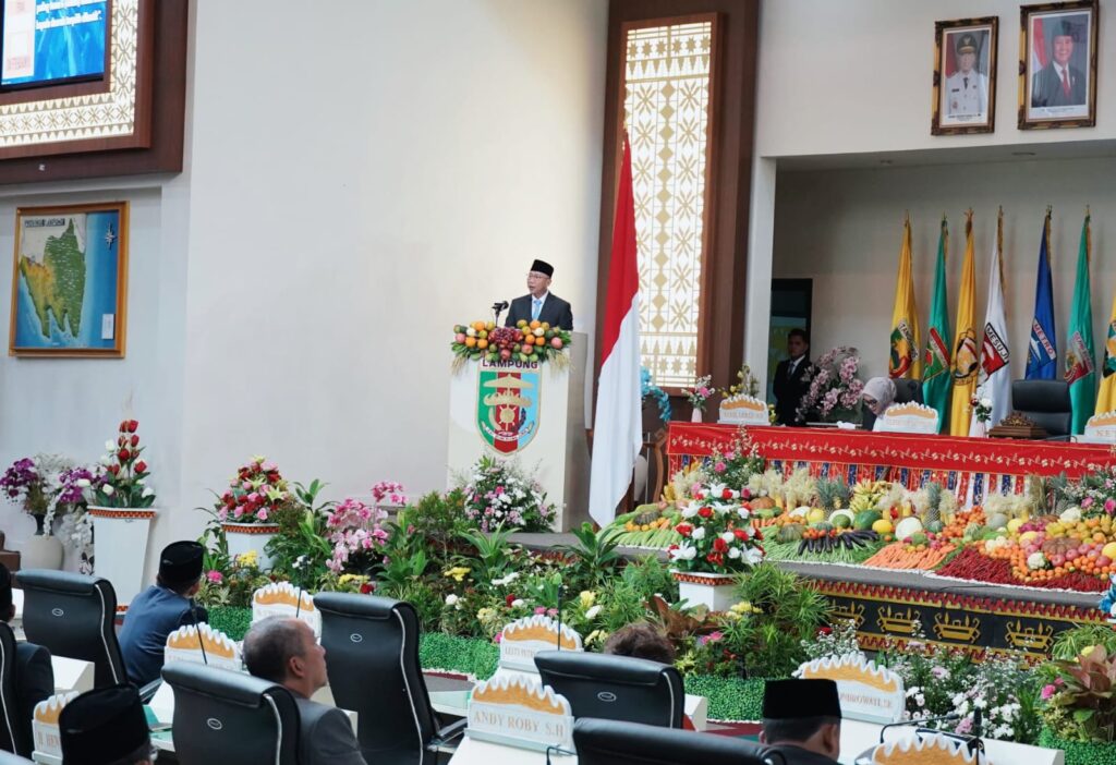 BANYUWULU.COM- Bandar Lampung —- Gubernur Lampung, Rahmat Mirzani Djausal, didampingi Wakil Gubernur Jihan Nurlela menyampaikan pidato perdananya dalam Rapat Paripurna Istimewa DPRD Provinsi Lampung, Selasa (4/3/2025).