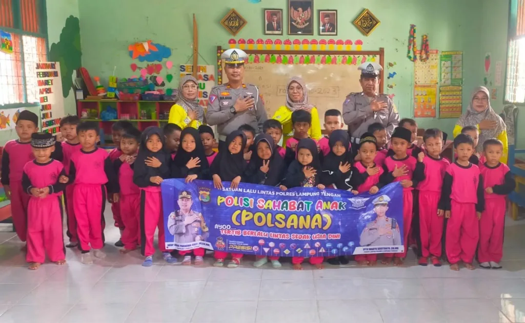 Banyuwulu.com – Lamteng – Polisi sahabat anak (Polsana), inilah momen kedekatan personil Satlantas Polres Lampung Tengah, Polda Lampung saat mengunjungi sekolah Taman Kanak-Kanak (TK) Maarif 13 Bandar Jaya. Jumat (13/10/23).