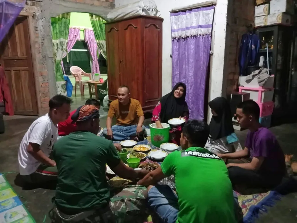 Di rumah bapak Hendrik, Rabu (11/10/2023) malam, anggota Satgas TMMD membaur di rumah orang tua asuh. Tanpa sungkan, mereka makan sambil lesehan penuh keakraban bersama orang tua asuh dan keluarganya.