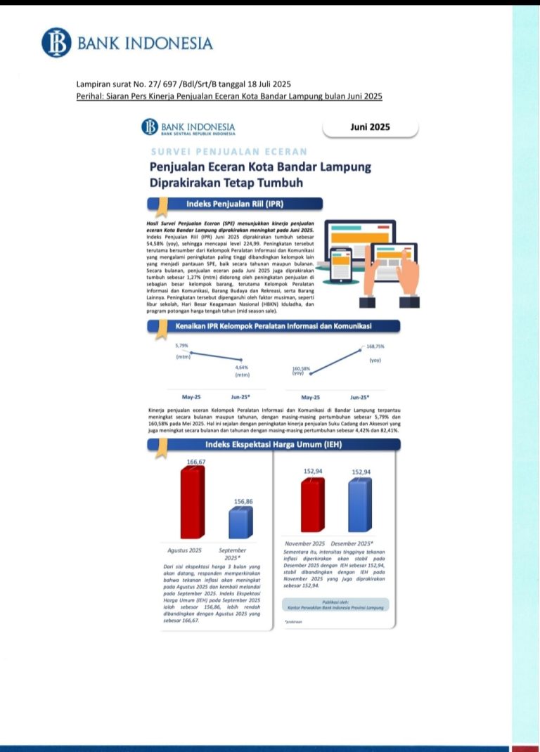 BANYUWULU.COM- Lampung – Kinerja penjualan eceran di Kota Bandar Lampung diperkirakan mengalami peningkatan pada Juni…