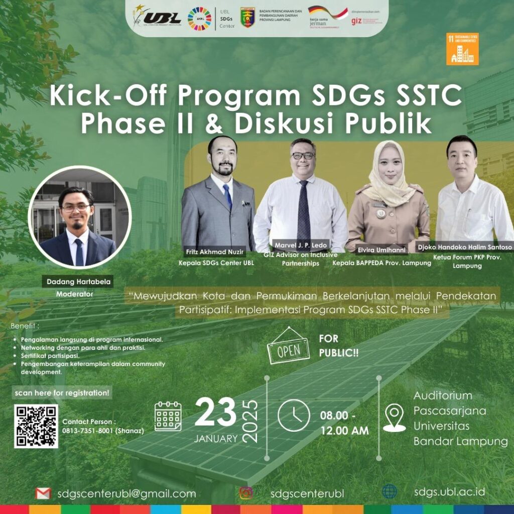 BANYUWULU.COM- Bandar Lampung – Universitas Bandar Lampung (UBL) akan menggelar kegiatan Kick Off Program Suistainable Develpoment Goals (SDGs) SSTC Phase II sekaligus Diskusi Publik. Kegiatan yang berlangsung pada 23 Januari mendatang di Auditorium Pascsarjana UBL, mengangkat tema “Mewujudkan Kota dan Pemukiman Berkelanjutan Melalui Pendekatan Partisipatif: Implementasi Program SDGs SSTC Phase II”.