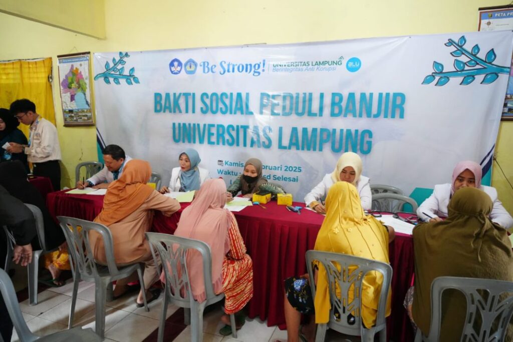 BANYUWULU.COM- Lampung – Universitas Lampung (Unila) menggelar bakti sosial berupa pemberian sembako dan pelayanan kesehatan gratis, sebagai bentuk kepedulian terhadap warga terdampak banjir di Cimeng, Kelurahan Pesawahan Bandar Lampung, Kamis, 2 Februari 2025.