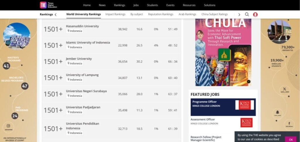 Unila Peringkat 16 Perguruan Tinggi Terbaik Indonesia Versi THE WUR 2024
